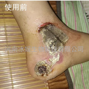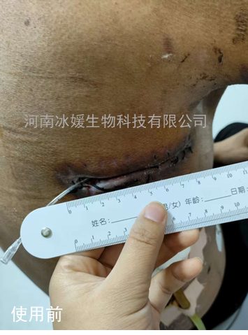 55岁男性患者,外伤术后两个月未愈合,感染发炎,伤口疼痛,有炎性渗出,使用冰媛玉液®外伤愈合液湿敷10小时,连续使用3天,效果明显,后期湿敷4小时,两...
