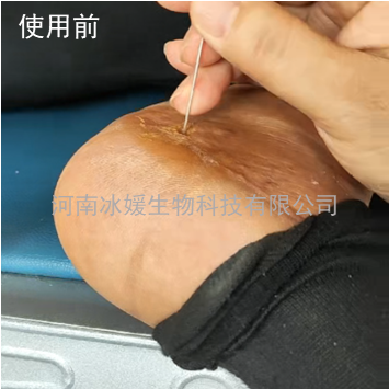 男性,胳膊磕伤后4天不愈合,去诊所就诊,使用冰媛玉液®外伤愈合液湿敷10个小时,打开后开放愈合,第二天后自己喷雾使用。