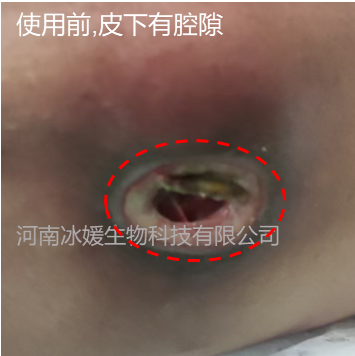 80岁男性,长期卧病在床,造成骶尾部褥疮,久治不愈,创面约4X5cm皮肤缺损有皮下腔隙 。深约2cm,可见溃烂软组织,散发有异味。在客服指导下使用冰媛...