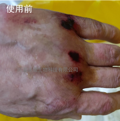 男性,手面擦伤,使用冰媛玉液®外伤愈合液湿敷10个小时,打开后开放愈合,第二天后自己喷雾使用。
