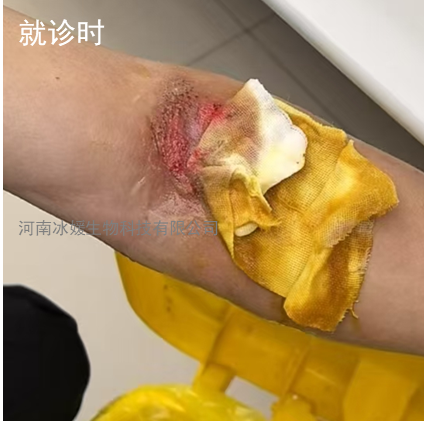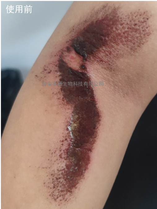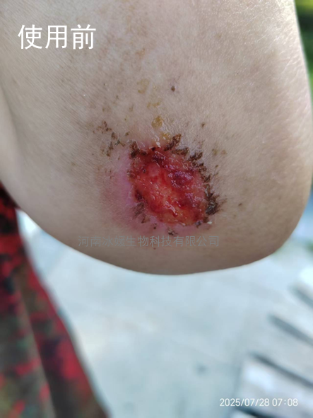 男性,胳膊磕伤后4天不愈合,去诊所就诊,使用冰媛玉液®外伤愈合液湿敷10个小时,打开后开放愈合,第二天后自己喷雾使用。