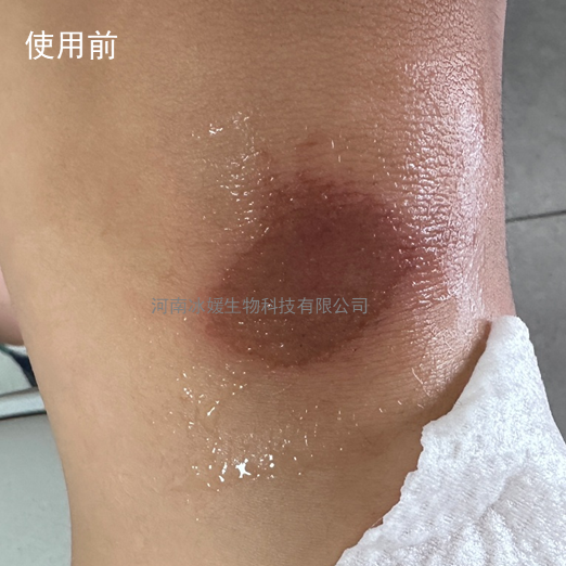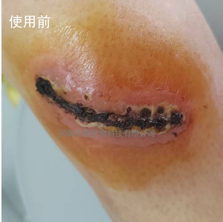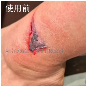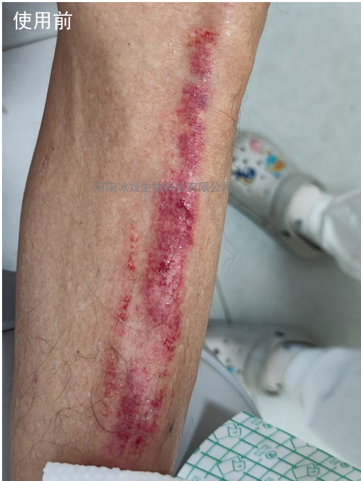 男性,小腿部位擦伤,使用冰媛玉液®外伤愈合液湿敷10个小时,打开后开放愈合,第二天后自己喷雾使用。全程无痛愈合。
