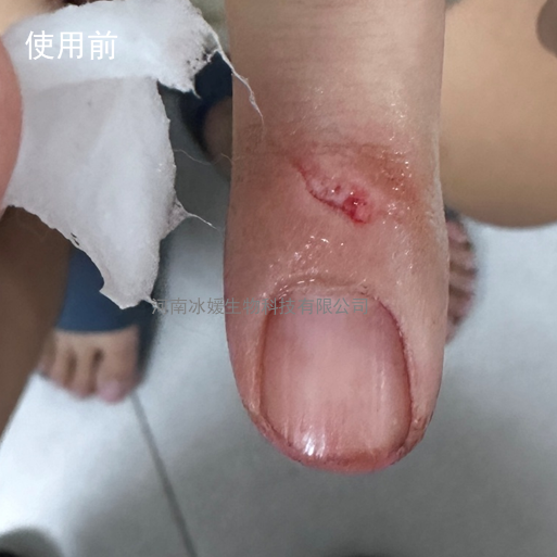 男性,手指划伤,使用冰媛玉液®外伤愈合液湿敷10个小时,打开后开放愈合,第二天后自己喷雾使用。全程无痛愈合。