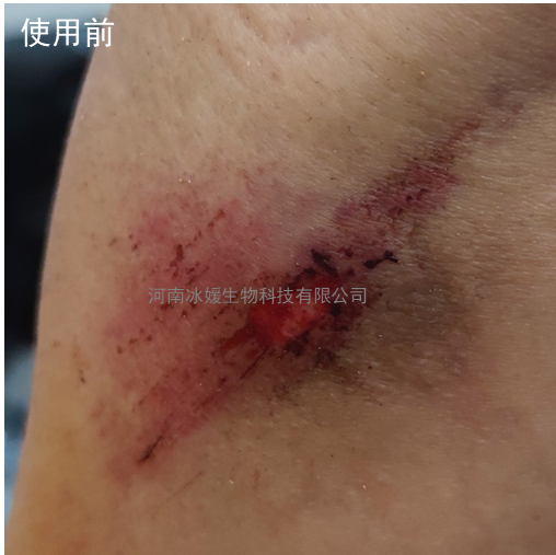 女性30岁, 骑电动车摔伤,摔伤后20分钟左右用冰媛玉液®外伤愈合液棉片蘸湿后于膝盖处覆盖,防水贴固定,12小时后打开。连续使用4天,膝盖恢复过程无疼...